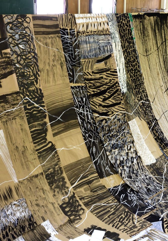 それまで東京で活動していたので、四万温泉の広大な自然、町の中を流れる川や滝に感銘を受けた。それらをモチーフに制作。滝の音、川のせせらぎ、虫の音、田園風景など中之条で感じたイメージをうつしとるように描いた。2階の欄干から床に向かってロール紙を垂らして流れていく滝を表現した